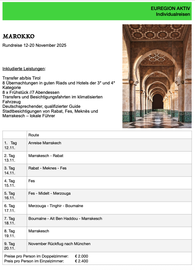 Marokko Rundreise; 12-20 November 2025