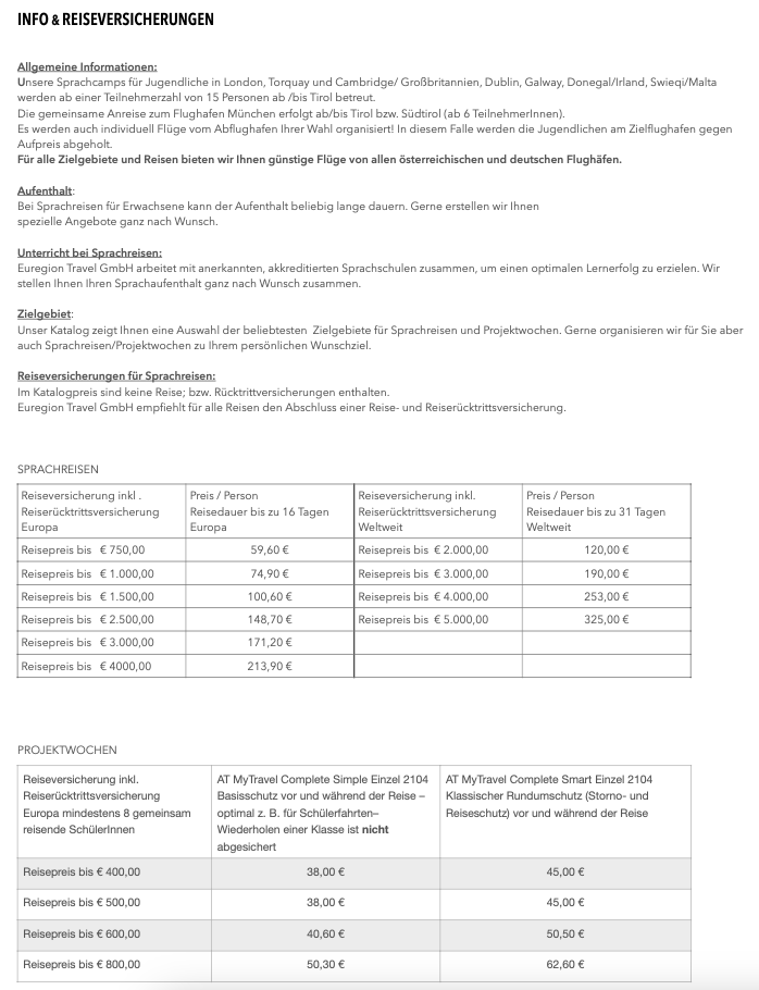 Im Katalogpreis sind keine Reise- bzw. Rücktrittversicherungen enthalten. Euregion Travel GmbH empfiehlt für alle Reisen den Abschluss einer Reise und Reiserücktrittsversicherung. Hier ein Auszug aus unserem Angebot.